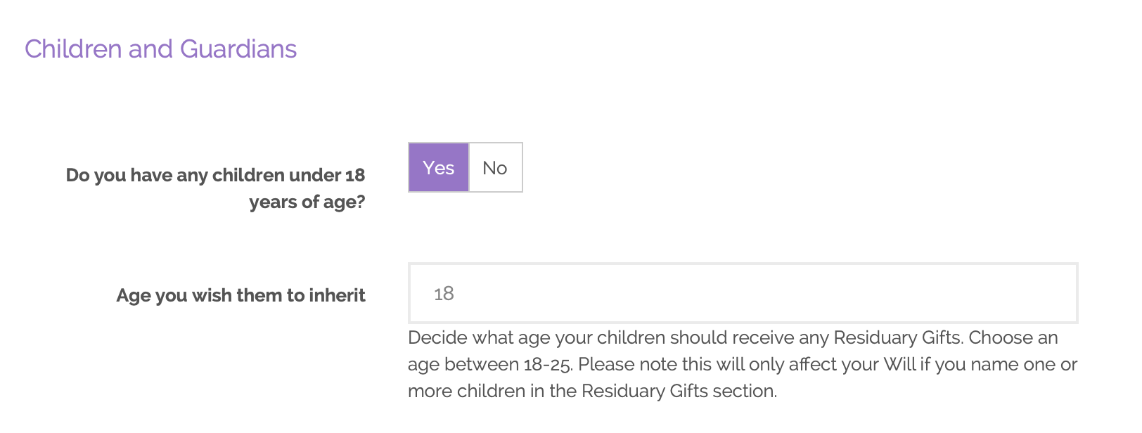 Hi Hannah! Thanks for getting in touch. When you choose to leave everything to your children on YWBD, there’s a little section right at the bottom of the first screen (Details). Just set the age of inheritance to 18 and you’re all set.